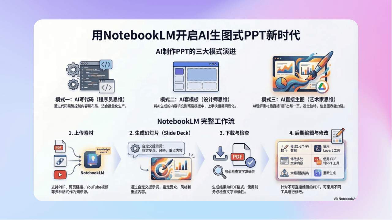 - 《实测有效:AI 生成 600 页 PPT 不翻车,全网最全 notebooklm 保姆级教程来了!》还在为做PPT发愁?作者陈天亲测,Google 的NotebookLM堪称PPT制作神器。文中毫无保留分享超全教程,从账号获取到生成导出,细节满满,还传授先得逐字稿再生成PPT的关键技巧。此外,针对常见问题给出4种改错别字方法,6种PPT风格任你选及固定风格妙招,长PPT制作也有奇招。最后强调打磨AI工作流的重要性,赶紧码住!
