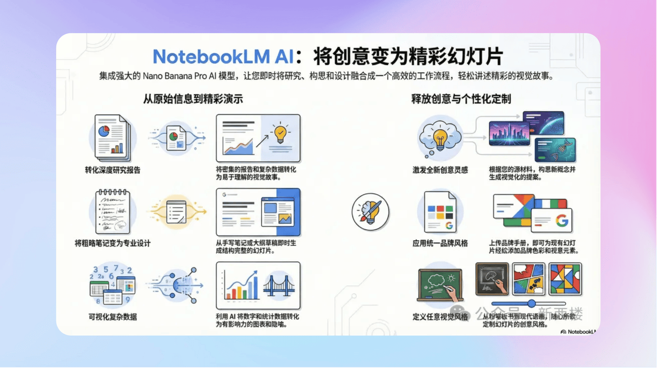 - 《实测谷歌官方指南:把NotebookLM生成PPT玩出花的8种最佳实践。》谷歌NotebookLM热度爆棚后“搞大事”,玩法超惊艳!新增数据表功能,是多源数据处理神器,各行业通用;Gemini APP与之打通,专题调用超方便。更绝的是,官方带来八种PPT玩法,不管是深度报告、粗略手稿,还是头脑风暴、品牌优化,都能轻松转化为精美PPT。这背后,是LLM交互向多模态转变的趋势,2026或许还有更多惊喜等我们解锁!