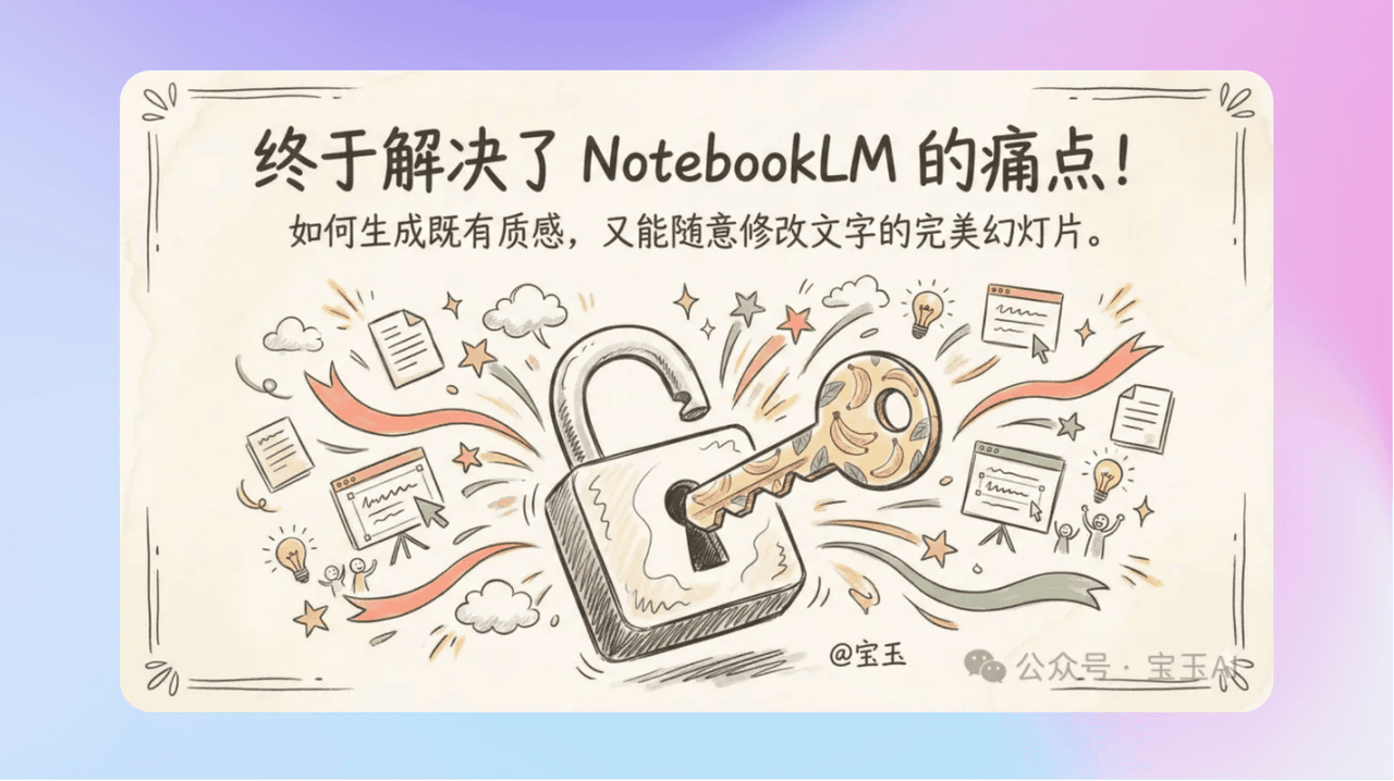 - 《预订本年度最有价值提示词 —— 生成既有质感,又能随意修改文字的完美 PPT》NotebookLM 生成的PPT质感绝佳却只能看不能改?这份方案完美解决这个遗憾 —— 宝玉打造的可定制工作流,让你既能拿捏同款高级质感,又能完全掌控PPT内容。只需要用封装好的 Gemini Gem 生成可修改的大纲与风格指令,再用 Nano Banana Pro 按指令绘图,就能对每一页做像素级调整,从风格到文字全由你说了算,轻松拥有颜值与自由度兼备的专属幻灯片!