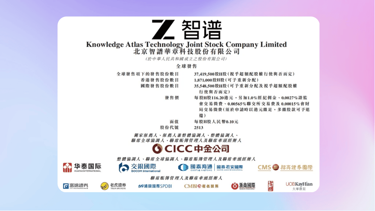 - 《市值511亿,1月8日IPO,大模型第一股花落智谱》1月8日,智谱即将在港交所主板挂牌,作为全球首家以AGI基座模型为核心业务的上市公司,备受瞩目!股票代码2513,市值511亿港元,发行价116.20港元,还引入11家基石投资者。募资重点用于大模型研发及优化MaaS平台。凭借MaaS模式,智谱商业化成果斐然,营收翻倍,研发投入大,GLM系列模型迭代快、性能优。在AI热潮中,智谱有望引领行业开启价值实现新篇章。