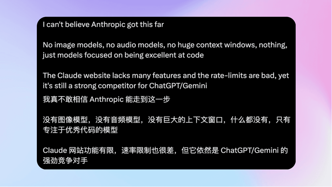 - 《我真不敢相信 Anthropic 能走到这一步》Anthropic没图像、音频模型,资源也不如巨头,却能凭文本模型与ChatGPT等抗衡,凭啥?因资源受限,它把模型压在Coding场景,这里对推理和容错要求高,能高效训练。为确保模型在Coding时稳定,Anthropic在训练阶段就狠抓可靠性。如此训练出的模型,在真实工作流中,因行为可预测备受企业青睐。行业模型的评价标准正从追求惊艳向注重稳定转变。