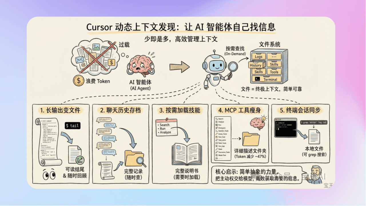 - 《Cursor AI 上下文管理的秘诀》别再一股脑给AI塞信息啦!Cursor提出“动态上下文发现”,让AI自己按需找信息。其中分享了五个巧妙优化手段,像把长输出、聊天历史存成文件,按需加载技能,给MCP工具瘦身等,核心都围绕文件展开。这与Manus理念契合,都看重文件系统在上下文管理中的作用。看来,上下文工程的关键,是让聪明的模型自主高效获取信息,less is more!