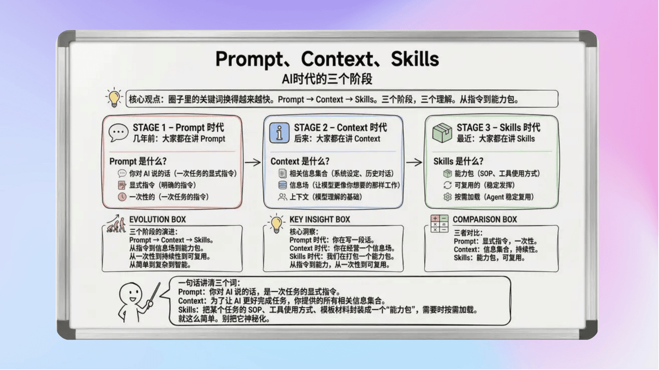 - 《甲木:从 Prompt 到 Agent Skills:AI 在业务场景应用有了新玩法!(附私董会Case)》新晋奶爸甲木回归带来Agent Skills的深度解析。从Prompt到Context,再到如今备受关注的Skills,它把经验变成可复用能力,解决通用Agent的“老毛病”。本篇文章不仅讲清Skills与Prompt、Context的区别,还教你如何写好它,通过实战案例展示用法。快来一探究竟!