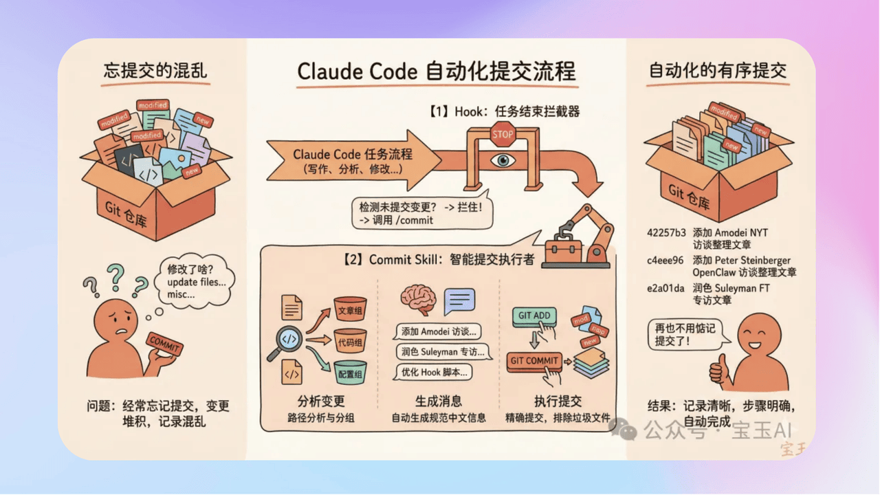 - 《用 Claude Code 的 Hook + Skill,实现每次提交后自从 commit 提交变更》宝玉带你用Claude Code实现写作Git版本管理自动化,彻底解决忘提交、记录混乱的痛点!通过配置Stop Hook钩子,在任务结束时自动检测未提交变更并进行拦截,避免修改遗漏;再搭建专属Commit Skill技能,让AI按主题分组提交、生成规范中文提交信息,拒绝模糊记录。钩子守关、技能执行,无需手动操作,就能精准追踪每一次文稿修改,让写作者彻底摆脱版本管理琐碎,全身心投入创作,高效又省心,快来上手试试!