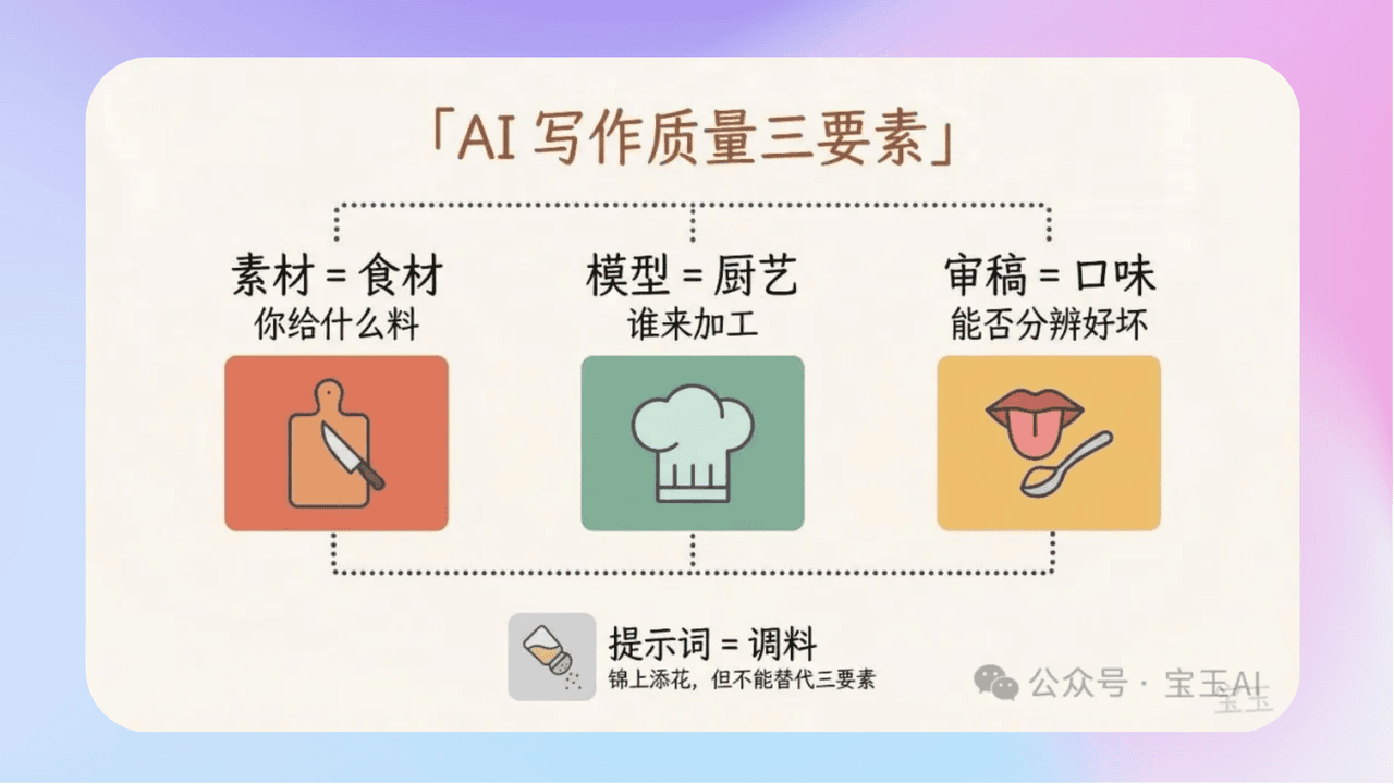 - 《提示词救不了平庸的 AI 写作》别再执着于打磨提示词,它仅仅能修饰表面,真正决定内容质量的是素材、模型、审稿能力。优质素材要凝练主线与关键信息,而非堆砌内容;选对模型是关键,Claude Opus 4.6等优质模型的文字把控力更优秀;审稿能力是最容易被忽略的隐性门槛,能精准挑错并反馈修改,才能让AI稿件摆脱平庸。三者兼备,才能让AI写出有质感、有价值的内容。