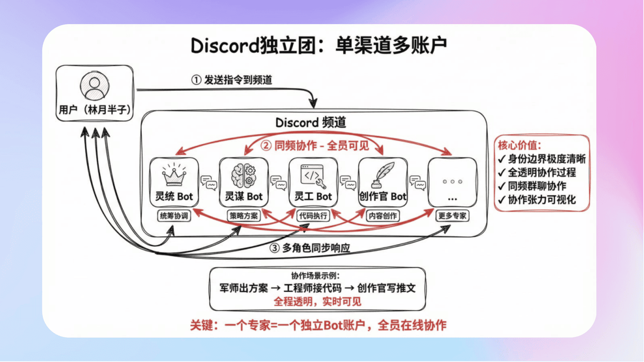 - 《OpenClaw多Agent实操:5个AI当着你的面分工协作,全程透明不黑箱》这篇Discord多Agent“灵系军团”实操指南,带你解锁全透明同频协作新玩法!不同于飞书单Bot分身的轻量模式,打造单频道多独立Bot账户的AI独立团,让各个角色实时协作、全过程可见可干预。从Bot账号创建、本地Agent部署,到路由绑定、权限配置、上下文打通,全流程步骤拆解+避坑指南,手把手教你搭建专属AI军团,一人轻松指挥多个AI专家高效配合!
