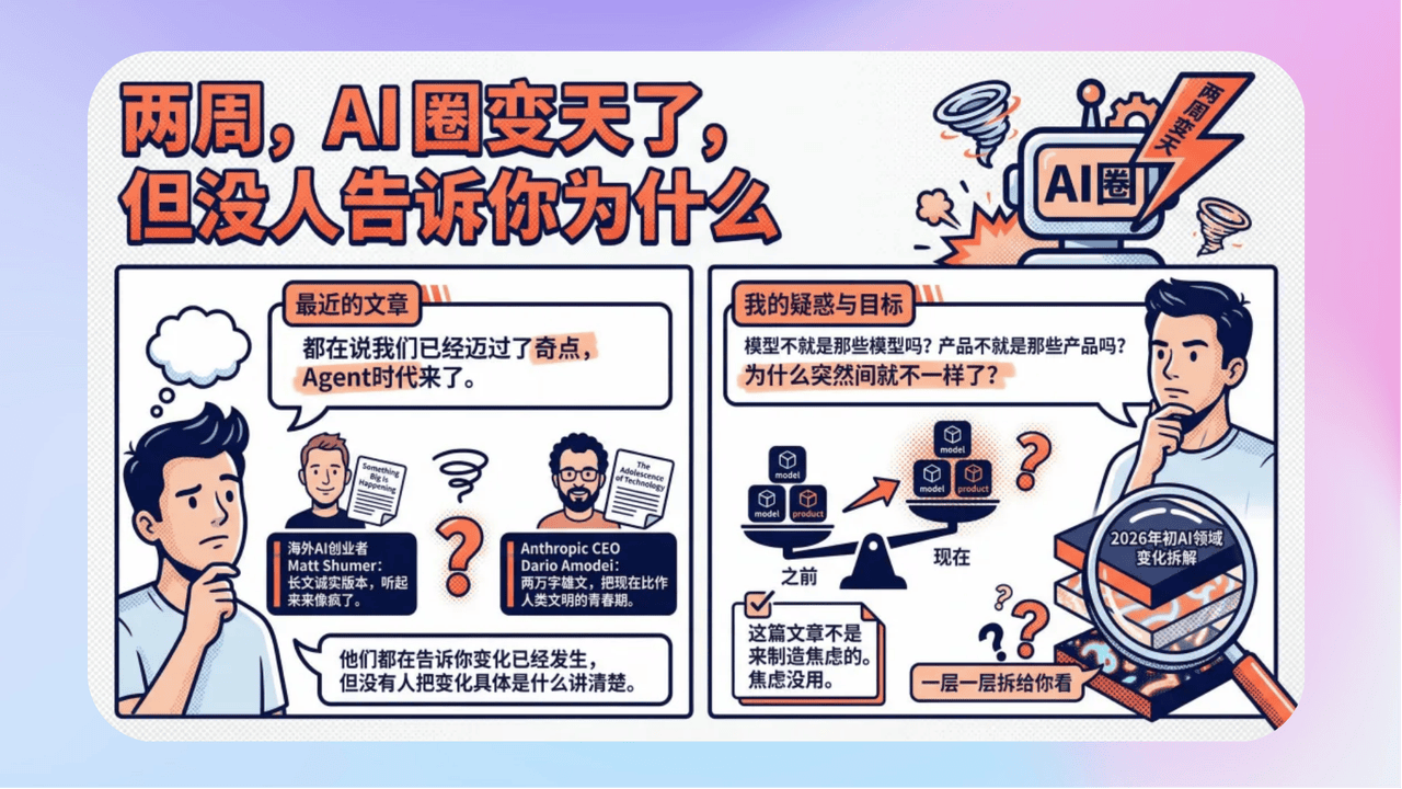 - 《过了个年,AI 圈变天了?但没人告诉你为什么》2026年AI已迈入 Agent 时代的全新阶段!顶尖模型已经具备专家级能力与自主判断力,能长时间独立完成复杂任务。Agent可本地运行调用全量数据,通过MCP协议连接各类服务,借助Skills快速解锁专业技能,甚至能操作图形界面、联动物理载体。多智能体协作更打破效率瓶颈,组队并行工作还能沉淀经验持续进化。臧师傅这篇文章把2026年初AI领域到底发生了哪些变化,一层一层拆给你看!