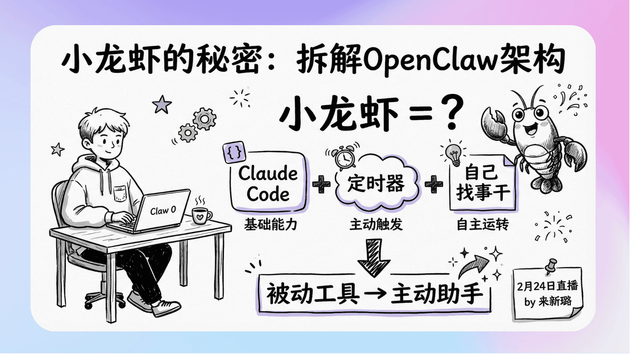 - 《直播总结 | OpenClaw技术架构拆解,带你手搓一个最小的龙虾》本篇文章带你拆解OpenClaw的核心技术架构,让AI助手不再神秘!它依靠定时任务、心跳机制与Soul人格文件,从被动工具变成能主动干活的智能体。00 后开发者来新璐现场手搓了一个极简版本,还实现了AI自动拨打FaceTime、智能下播等名场面,趣味性与实用性拉满。
