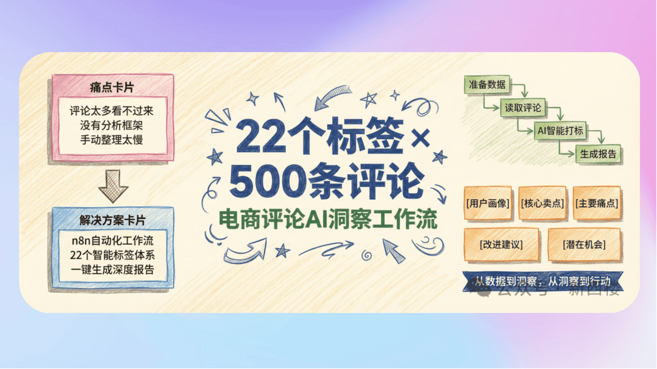 - 《用22个标签拆解500条评论后,我搭了一套全网最深度的电商评论AI洞察工作流。》作者开源了基于n8n搭建的评论深度分析工作流,搭配Gemini API实现22个维度的智能打标,自动生成有数据支撑的定量+定性分析报告,还能精准筛选高价值评论的解析。文章中附有完整源码和教程,教你从报告中挖掘可落地的商业机会。快来一同挖透评论里的用户需求、竞品痛点与市场空白!