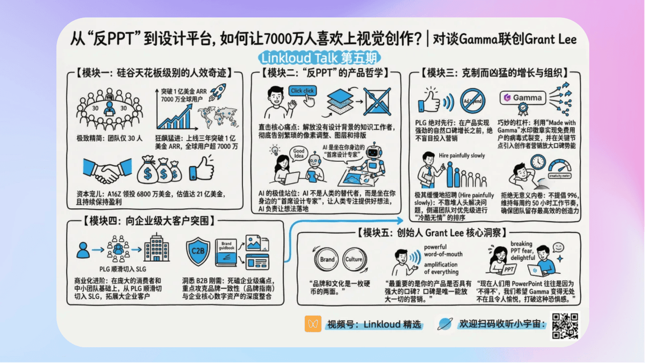 - 《对谈Gamma创始人Grant:如何让7,000万用户爱上视觉创作|Linkloud Talk》Linkloud Talk本期邀请到Gamma的创始人Grant Lee。Gamma最早从“革命”Powerpoint 切入,在上线至今3年多的时间里,以极高的人效在去年突破1亿美金的ARR,用户突破 7000万,并且完成了a16z领投的6800万美金的融资,估值高达21亿美金。Grant 分享了创业以来的公司治理理念、以及在高速发展阶段如何保持竞争力,营销与增长上的挑战和最佳实践!