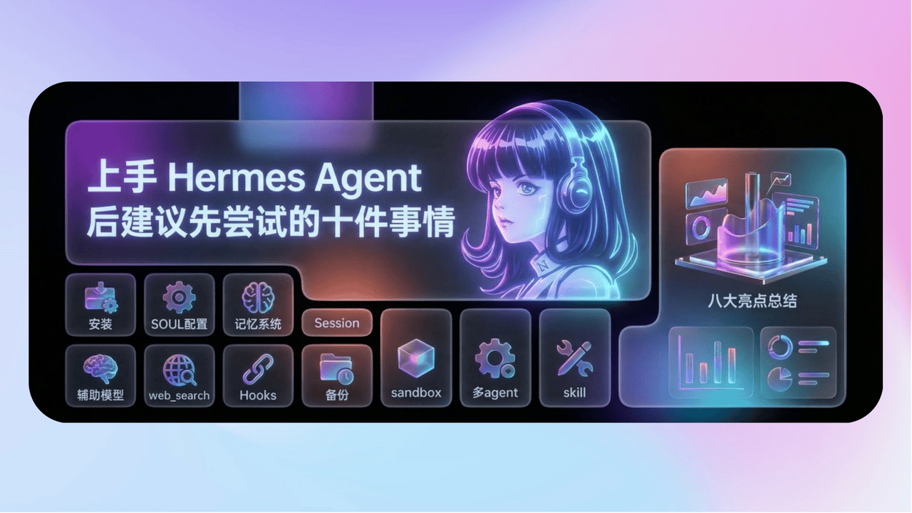 - 《上手 Hermes Agent 后建议先尝试的十件事情》本文通过上手实践操作Hermes Agent ,给出了安装Hermes 后建议先尝试的十项功能,内容非常丰富,纯手敲,经过源码review和实验验证。 并通过尝试,也总结了Hermes 的八大亮点,都在文中了,欢迎阅读交流~