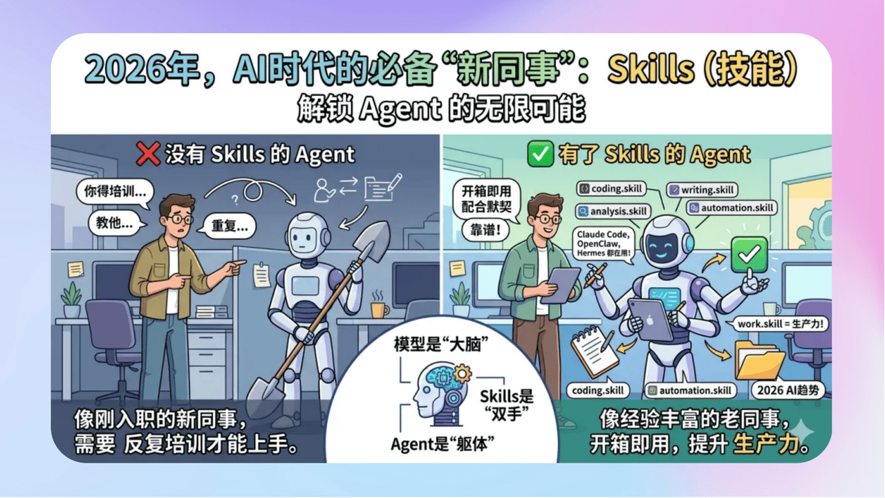 - 《万字干货!Agent Skills从入门到精通》2026年最值得学习的AI技能是什么?毫无疑问是Skill。无论是Claude Code,还是龙虾、爱马仕,几乎所有的Agent,如果想把事情干得又快又好,都越来越依赖Skills。今天这篇文章,作者带大家从入门到精通,彻底搞懂Skills ——理解skill,成为skill,超越skill。
