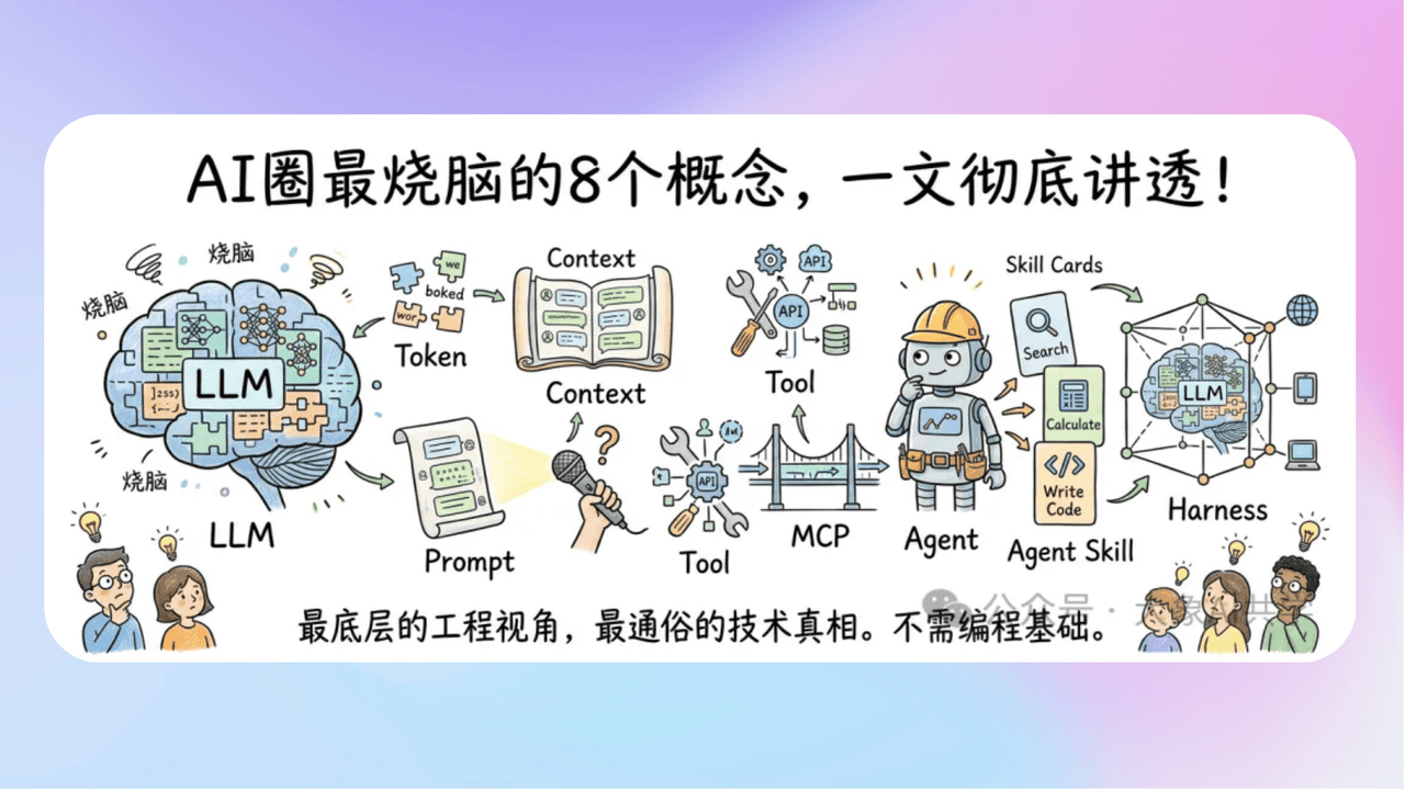 - 《Harness、LLM、Token、Agent、MCP…AI圈最烧脑的8个概念,一文彻底讲透》LLM、Token、Context、Prompt、Tool、MCP、Agent、Agent Skill、Harness……随便拎一个出来,很多人其实说不太清它到底指的是什么。更扎心的是, 你以为你懂了,但一深入追问,发现全是模糊的。这篇文章,作者从最底层的工程视角出发,把AI的核心概念一个个拆开讲透。