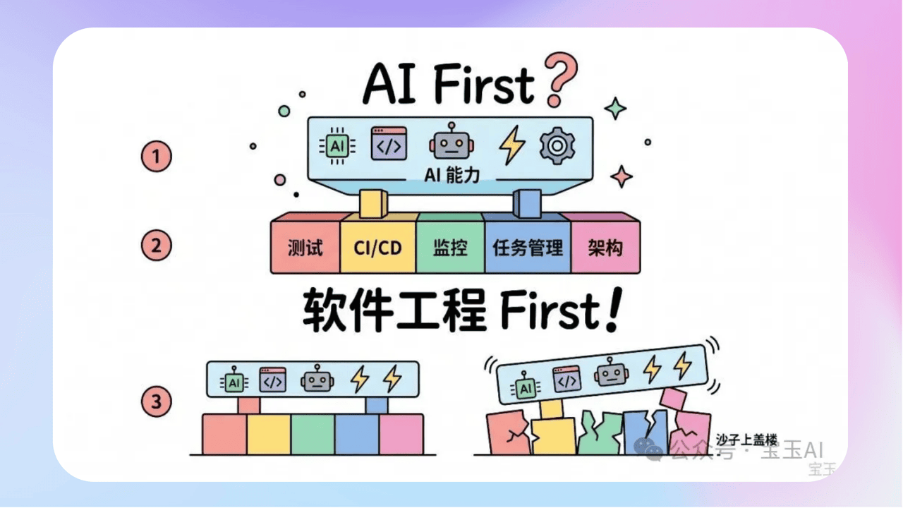 - 《为什么你的"AI 优先"战略可能大错特错?》AI First并不是简单的叠加工具,而是以软件工程为底座来重构全流程。真正的“AI 优先” (AI-first),意味着你要基于“AI 是主力构建者”这一核心假设,彻底重新设计你的流程、架构和组织。 你要停止问“AI 能怎么帮助我们的工程师?”,转而问“我们该如何重构一切,让 AI 去做构建工作,而工程师只负责指引方向和判断好坏?”