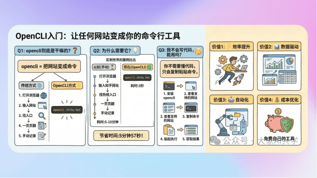 - 《OpenCLI入门:让任何网站变成你的命令行工具(超详细版)》OpenCLI把复杂网页操作变成极简命令,一行指令就能秒查热榜、搜爆款、导数据,大幅提升信息获取效率。依托后台服务与浏览器插件联动,可以覆盖知乎、小红书、GitHub等数十平台,既能支撑内容创作者快速找选题,也适合程序员高效查项目。本篇指南,小白也能快速上手,彻底告别繁琐手动操作。