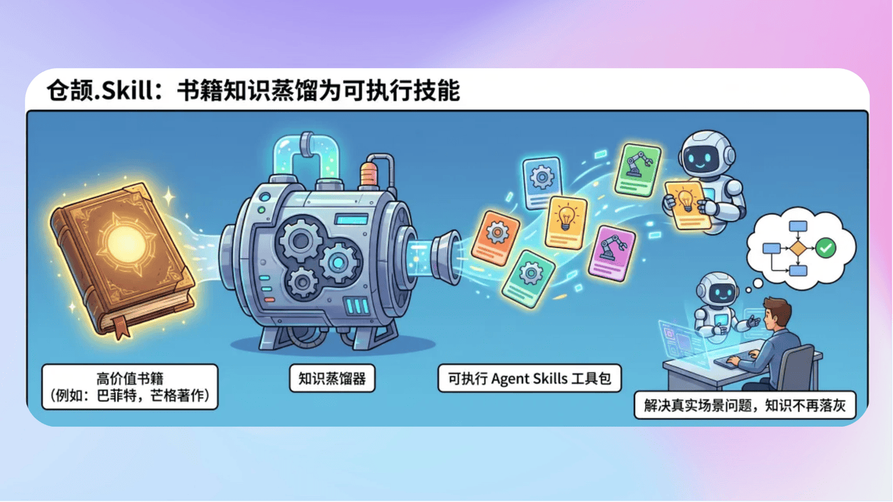 - 《开源「仓颉.Skill」,你现在可以蒸馏任何书!》我们可以蒸馏一个人,为什么不蒸馏他花了大量时间写的书呢?书是一个人花了大量时间沉淀下来的深度思考,是他反复推敲,实战沉淀下来的精华。蒸馏大佬们写的书,你能拿到他们的方法论,那是真正可落地的验证过的经验。于是我决定干一件事: 做一个能蒸馏任何书的 skill,然后让Agent帮我们把这些知识用起来!于是 仓颉.Skill 就这么诞生了