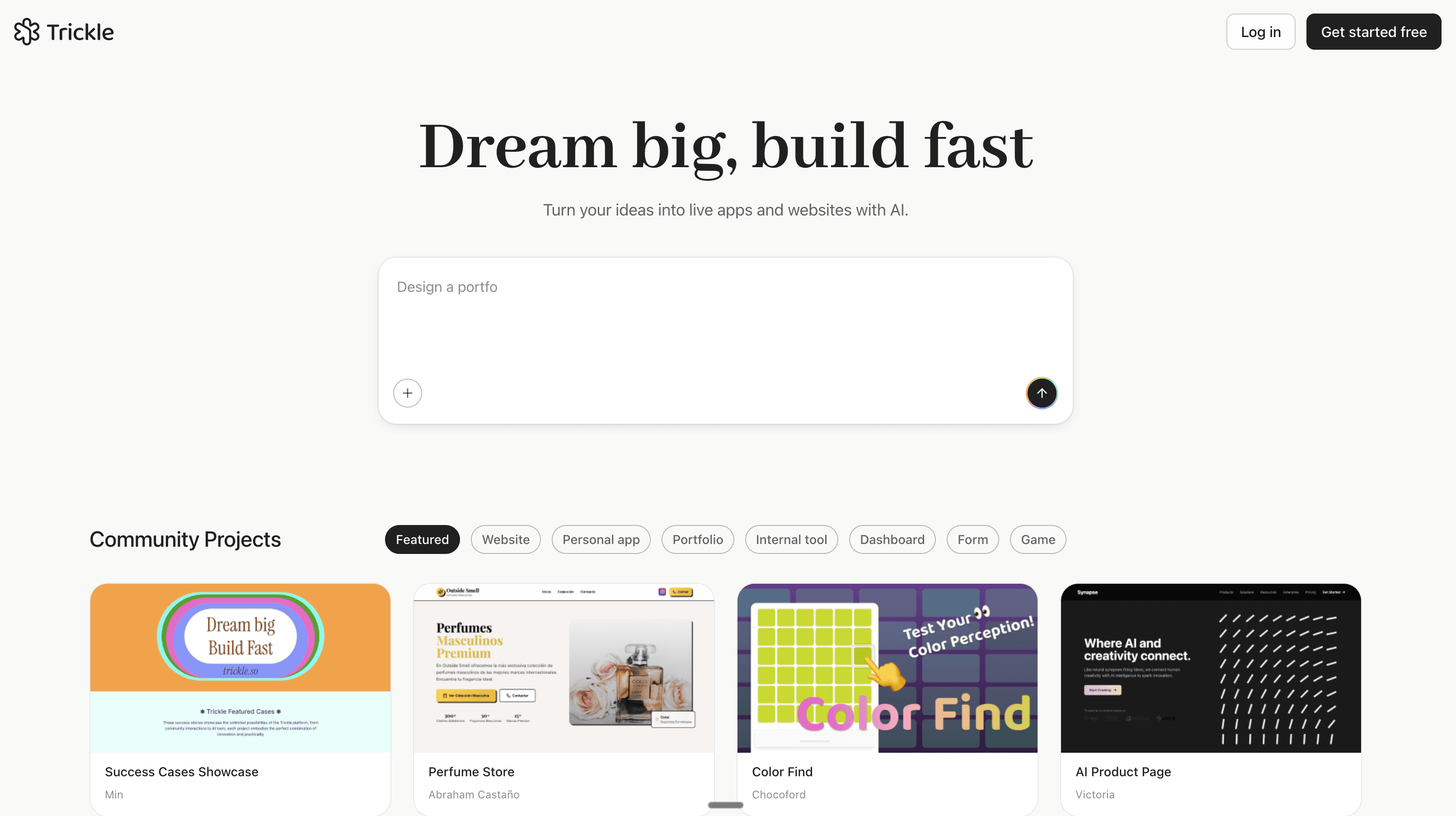 Trickle 让用户能够通过自然语言快速创建网页应用和网站,无需编程知识。其核心理念是"Dream big, build fast"(梦想大,构建快)。